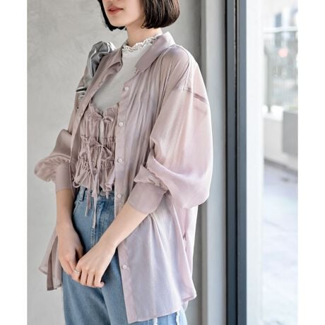 シンプルなシアーシャツにキャミソールビスチェがついたセットアイテム。