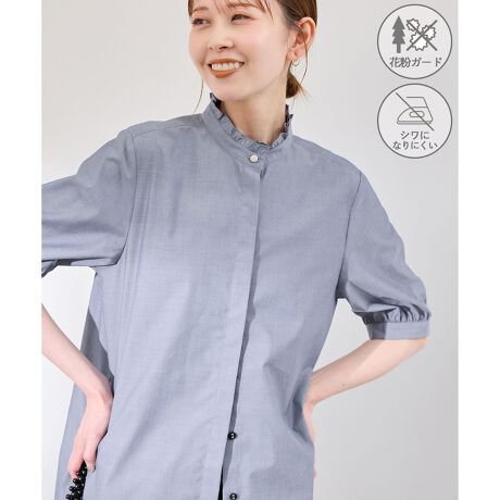 ・コンパクトなスタンドネックにフリルを飾った、ノーブルなハーフスリーブシャツ。