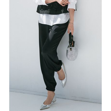 すっきり細身に仕立てたジョグパンツ。裾口はゴムギャザーなので足首が細見えし、また内側へ折り返してパラシュートパンツのようにも着用していただけます。Tシャツやニットなどのトップスと合わせてラフにスタイリングするのはもちろんですが、カジュアルダウンしすぎないきれいめな素材で作っているので、ブラウスと合わせてお仕事服としても活躍する1枚です。カラーは、アイボリー寄りの明るいベージュ(#033)、シックなブラック(#005)、春らしい爽やかなライトグリーン(#062)の3色展開です。