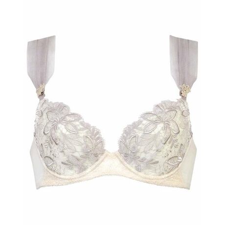 神秘的な陰影を映し出す世界曖昧な陰影に彩られた、ミステリアスな世界への逃避行。繊細なタトゥーのように肌に浮かび上がるレースや重なり合うチュールの陰影が神秘的なオーラを演出。ラメ糸で上品な輝きを添えて。研ぎ澄まされた感性が光るエレガントなグループ。●ふっくらとした谷間をメイク 伸びない素材の脇布でバストを寄せて、前中心の低いワイヤーでまるみのあるシルエットに●軽やかなつけごこち 軽量化にこだわった素材使いとカップ脇上辺〜バック上辺・アンダーは伸びのよいストレッチテープを使用・重なり合うチュールの陰影や、さりげなくあしらった上品な輝きのラメ糸のモチーフなど、手仕事の美しさがポイントのエレガントなデザイン・ストラップにあしらったチュールパーツは、アウターに合わせて位置を変更したり、取りはずしも可能