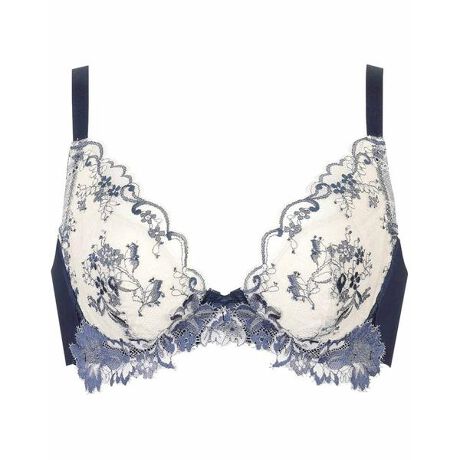 ●バストを美しいポジションで安定 ストラップと連動したカップ脇切り替え構造が、面で脇をやさしくおさえながら、バストを引きあげる 前中心の低いワイヤーで胸の谷間を美しく見せる●脇から背中のラインをすっきり バックはテープレスでしめつけ感が少なく、脇や背中に段差がつきにくい カップ脇上辺とアンダーは伸びのよいストレッチテープを使用・花が連なった印象的なリバーレースがやさしくエレガントな雰囲気・カップ下にリバーレースのアップリケを飾って華やかな印象に