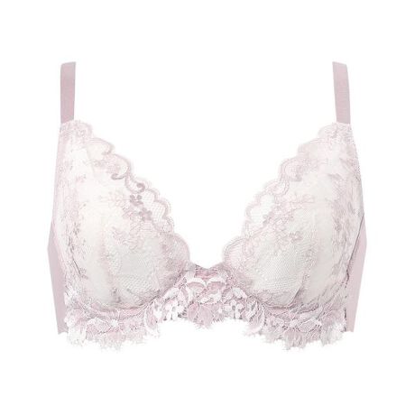 ●バストを美しいポジションで安定 ストラップと連動したカップ脇切り替え構造が、面で脇をやさしく押さえながら、バストを引き上げる 前中心の低いワイヤーで胸の谷間を美しく見せる●脇から背中のラインをすっきり バックはテープレスでしめつけ感が少なく、脇や背中に段差がつきにくい カップ脇上辺とアンダーは伸びのよいストレッチテープを使用花がリズミカルに連なり繊細な模様を描くリバーレースをふんだんにあしらい、やさしくエレガントな雰囲気に仕上げました。カップ下にもリバーレースのアップリケを贅沢に飾って華やかな印象に。独自のカップ切り替え構造で、脇をやさしく押さえながらバストを引き上げ、美しいポジションでキープします。前中心の低いワイヤーで美しい谷間を演出し、バックはテープレス仕上げで気になる脇や背中の段差をスムージング。前あきブラウスや着ぶくれしやすい服をすっきりきれいに着こなせます。