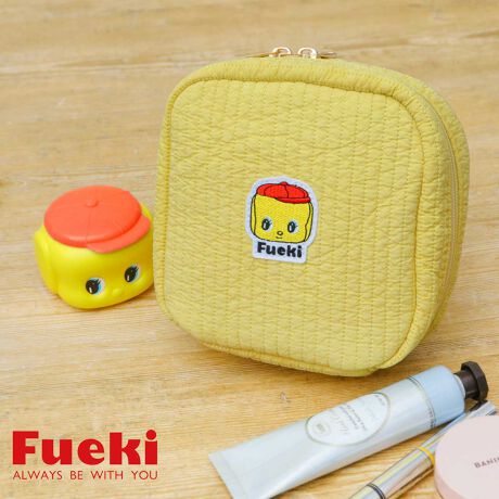 つぶらな瞳の黄色い犬のキャラクター「フエキくん」の刺繍ワッペンが可愛らしい、スクエア型メイクポーチ。