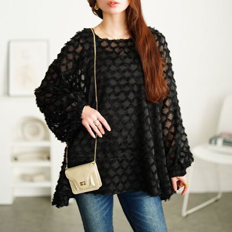 柔らかなフリンジが躍るトレンドスタイルが決まる着映え力の高いトップスは、シフォンの生地に毛足の短めなフリンジジャガードが重なり、トレンド感と高見え効果に。ふんわりとボリューム感のあるスリーブが、レディなスタイリングに仕上げます。ふわっと広がるフレアシルエットで、柔らかな印象をプラスし、着映え力アップに。全体にゆったりとした着心地がリラクシーさを演出し、長時間快適。裾には別布の裏地と縫い合わせることで透け感を抑え、ヒップや脚の付け根部分をカバーしてくれます。インナーとの掛け算が楽しめるシフォン地が、軽快さを演出する大人な一枚。