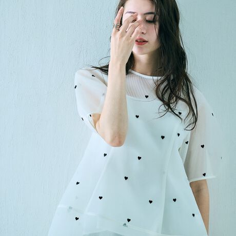 ・ハートモチーフの刺繍がなんともかわいらしく、カジュアルからドレス感のあるスタイリングにと、幅広く活躍してくれるアイテム。