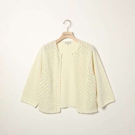 ローゲージに編まれた透け感のある涼やかなムードで春夏シーズンにぴったりな7分袖ニット。異なる編み模様がドッキングされたスタイリッシュなデザイン。フロントボタンのないすっきりとしたデザインでさっと羽織るのに最適。いつもの着こなしにプラスして、エレガントな雰囲気のコーディネートが実現するアイテムです。