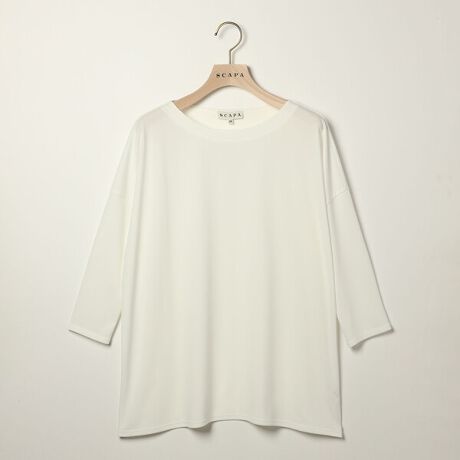 エレガントなムードの7分袖カットソー。ウエスト下まである長めの丈感のチュニック仕様でフェミニンなムード。トレンド感のあるゆとりのあるフィット感も魅力。シンプルなデザインとコーディネートしやすい落ち着いたカラーで、あらゆるボトムとマッチ。デイリーに活躍する汎用性抜群のアイテムです。