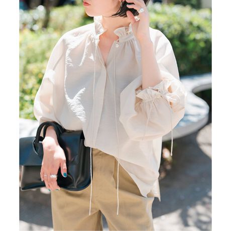 ゆったりしたサイズ感により、ギャザーの動きがより映えるブラウスです。