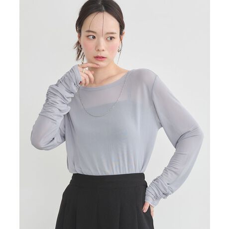 伸縮性に富んだ滑らかな風合いが着心地抜群のデザインプルオーバー。ソフトなシアーでレイヤードにアクセントを加えてくれる着回し力の高い一枚です。クシュッとさせたギャザーがポイントの長めのシャーリングスリーブ。ラウンドネックにベーシックなフォルムでインナーとしても幅広く活躍してくれます。
