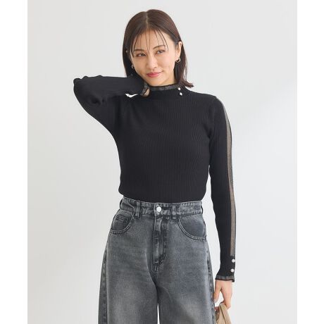 ハイネックや袖のシフォンフリル使いがフェミニンなプルオーバー。肌見せが苦手な方でも安心して着用いただける、程よい透け感が女性らしい1枚です。首元の艶めくワンポイントモチーフも上品なアクセント。柔らかく伸縮性のあるリブニット素材で着心地良く、インナーとしても活躍してくれる汎用性の高いアイテムです。透け感[ややあり]