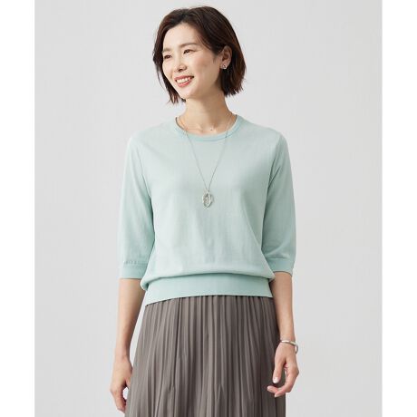 ■デザインシンプルなクールネックプルオーバー。袖丈はひじ下丈にし、身巾とのバランスにこだわりました。一枚着として着まわせるのはもちろん、カーディガンとアンサンブルでのスタイリングもおすすめです。袖口につけたオリジナルロゴ釦が上品アクセントになった一枚です。