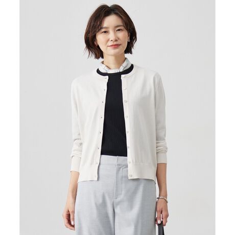 ■デザインシンプルなクルーネックカーディガン。ベーシックなデザインなので、どんなボトムスともスタイリングしやすい1着です。サイドの編地切り替えがアクセントとなっています。今季はオリジナルメタルロゴ釦の形をアップデートし、繊細で上品な印象に仕上げました。春の季節に丁度良い軽さのカーディガンで、1枚持っているととても便利です。