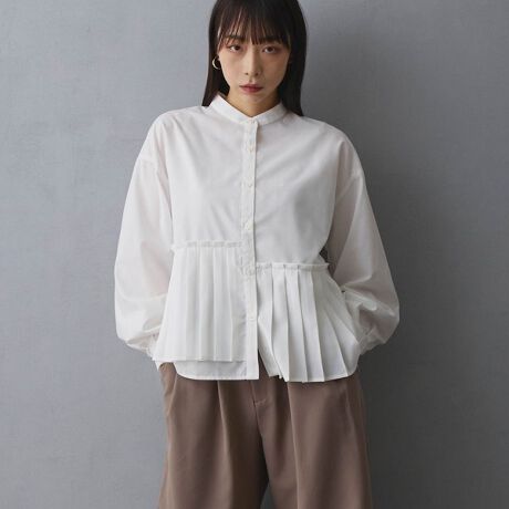 本体とプリーツで異なる素材は、同色に合わせることで綺麗めなデザインシャツにしています。
