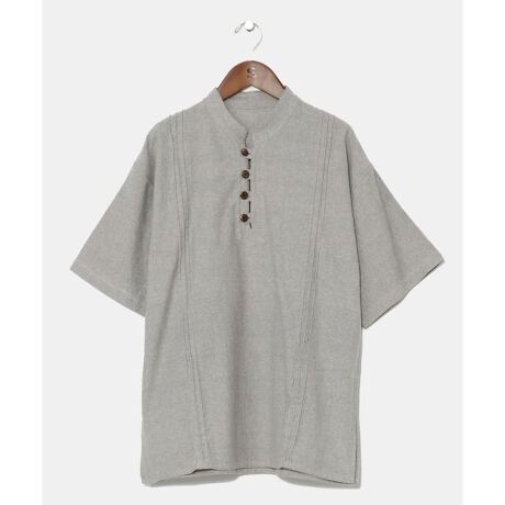 [型番:NWW-5103-2025]2色の糸で織られたネパールコットン生地のメンズトップス。肌ざわりが良く、薄地で通気性に優れている。ベーシックなスタンドカラーが魅力的な半袖クルタ。Mサイズ。