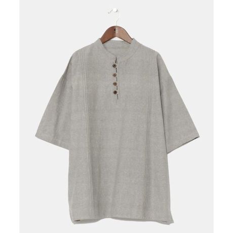[型番:NWW-5104-2025]2色の糸で織られたネパールコットン生地のメンズトップス。肌ざわりが良く、薄地で通気性に優れている。ベーシックなスタンドカラーが魅力的な半袖クルタ。Lサイズ。