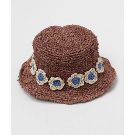 [型番:NSRP5108-2025]ヘンプ糸で編まれたハットに手編みクロッシュの花飾りが付いており、ヒッピー感もある可愛らしい一品。ワイヤー入りなので、自分の好きな形に変えて楽しむことも可能。