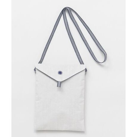 アマテラス/ツクヨミ/スサノオの刺繍がワンポイントの御守。近江麻を使用しています。悪を祓う力があると云う麻生地で作ったショルダーは、御朱印帳をぴったり収納することが出来ます。紐には倉敷市で作られた丈夫な真田紐を使用。