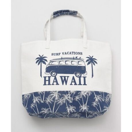 [型番:47AP5103-2025]キャンパス生地の大容量のトートバッグ。ハワイのモチーフが大胆に装飾され目を惹きます。持ち手が太く、肩が痛くなりにくいです。開口部にはマグネットがついており安心のデザイン。