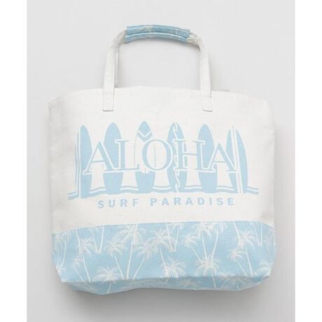 [型番:47AP5103-2025]キャンパス生地の大容量のトートバッグ。ハワイのモチーフが大胆に装飾され目を惹きます。持ち手が太く、肩が痛くなりにくいです。開口部にはマグネットがついており安心のデザイン。