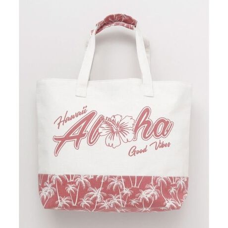 [型番:47AP5103-2025]キャンパス生地の大容量のトートバッグ。ハワイのモチーフが大胆に装飾され目を惹きます。持ち手が太く、肩が痛くなりにくいです。開口部にはマグネットがついており安心のデザイン。