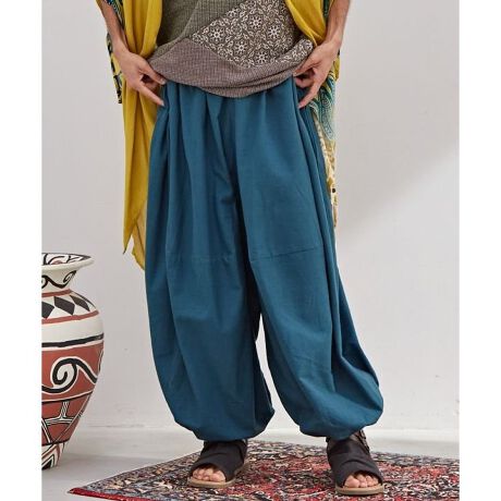 [型番:NWW-5107-2025]ネパールのコットン素材を使用したメンズパンツ。立体感をイメージした張りのある生地感と、一枚の布から作られる変形シルエットに注目。サイドポケットあり。