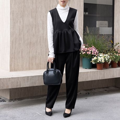 程よいペプラムで美しいシルエットラインを演出しながらスッキリ綺麗めに仕上げました。
