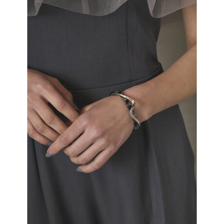ニュアンス感のあるべっこう風デザインと、ウエーブしたメタルのラインを組み合わせたバングル。ぱっと目を惹く存在感で、手元にアクセントをプラスしてくれます。カジュアルにもきれいめなスタイルにも合わせやすく、様々なシーンで活躍するアイテムです。