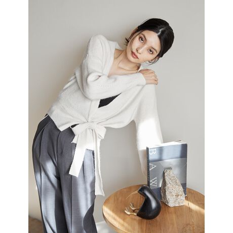 デコルテをきれいに魅せるカシュクールデザインが女性らしい印象のニットプルオーバー。サイドにあしらわれたリボンが、アクセントをプラスしてくれます。様々なボトムスと合わせやすく、ワンピースにレイヤードしたスタイリングもおすすめです。