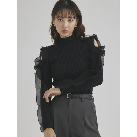 袖にあしらったプリーツフリルが印象的なハイネックニット。ボディにフィットするシルエットと、オープンショルダーデザインが女性らしさを引き立てます。一枚ではもちろん、ジャンパースカートやサロペットのインナーとしても活躍するアイテムです。