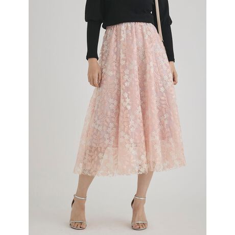 繊細なフラワー刺繍が目を惹く、ミディ丈のチュールスカート。程よい透け感と、裾に向かってふんわり広がるシルエットがフェミニンな雰囲気を演出します。ウエスト部分はゴム仕様になっているので、ストレスフリーな穿き心地も嬉しいポイントです。