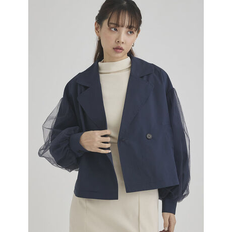 ショート丈がすっきりとした印象のトレンチコート。バックのフリルと、ふんわりとしたチュール袖が女性らしい雰囲気を演出してくれます。カジュアルボトムにもフェミニンなスカートにも合わせやすく、さまざまなスタイリングに活躍するアイテムです。