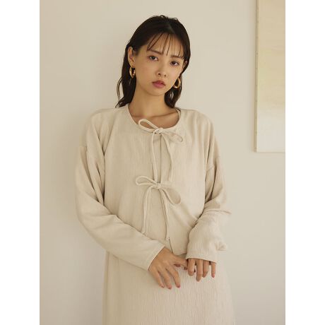 表面に細かい凹凸のあるブリスタークレープ素材を使用したカーディガン。フロントに施したダブルリボンが、女性らしい印象を与えてくれます。短めの丈感なので、ハイウエストのボトムスやワンピースともバランス良く合わせられるアイテムです。