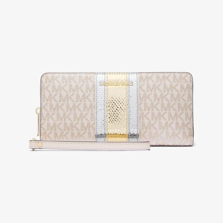 洗練されたデザインのJET SET TRAVEL メタリック コンチネンタル ウォレット ラージ - MKシグネチャー。アイキャッチなメタリックのスネーク エンボス加工が施されたセンターストライプが特徴。スマートフォン用ポケットや多数のカードスロットを備えています。旅行や通勤時に欠かせないアイテムで、キャリーオールに簡単に収納できるほか、リストレットとしても使用できます。