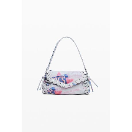フラップがマグネット式で、交換可能なハンドルとコラージュ風プリントが施された小さなクロスボディバッグ。トリートとエレガンスを融合させたデザインが魅力のショルダーバッグ。ソフトなカラーリングのコラージュ風プリントが施された生地に、