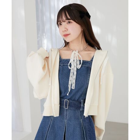 フード部分は立体感を際立たせるために2重仕立てにし、フードに沿ったレースと繊細なレースフード紐がポイントです。