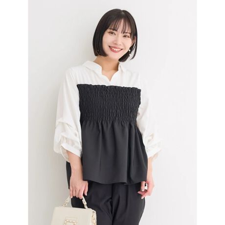 シャツにビスチェをレイヤードしたようなドッキングデザインのトップス。