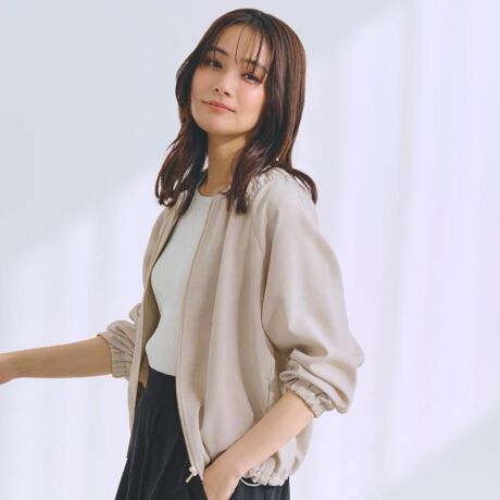 リネンライクな風合いが特徴のノーカラーブルゾン。