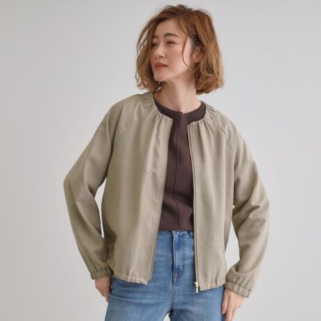 リネンライクな風合いが特徴のノーカラーブルゾン。