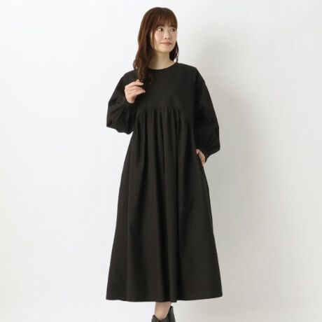 たっぷりのギャザーと、特徴的な前身頃の切替がポイントのワンピースです。