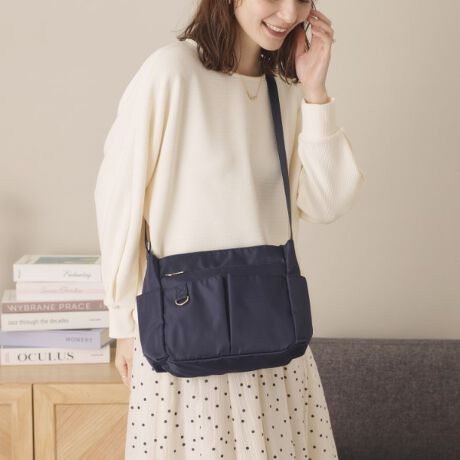 張りのある軽量ツイルポリエステルを使用した9ポケットショルダー。