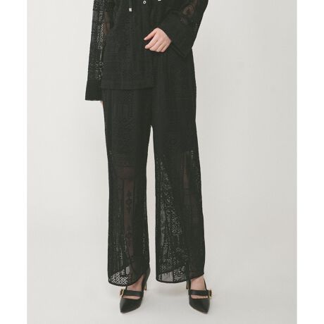 大きなピッチのキカ柄パネルレース生地でお作りしたイージーパンツ。適度な透け感を活かしあえて膝下から裏地をつけず涼やかに仕上げる事で、今年らしい新鮮さを感じて頂けるデザインに。ウエストゴムのイージー仕様が、気取らないリラックスしたおしゃれを楽しめるポイント。お揃いでお作りしたトップスとセットで着る事で、ワンランク上のセットアップスタイルをお楽しみいただけます。