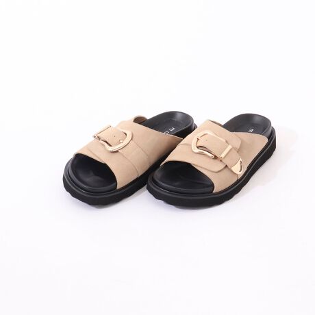 ・存在感のあるゴールドバックルがポイントのスエードサンダル