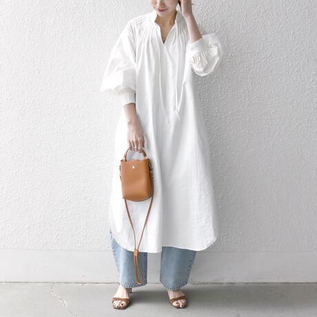ピンタックのディテールとボリューム袖がポイントのスタンドカラーシャツワンピース。
