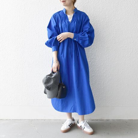 ピンタックのディテールとボリューム袖がポイントのスタンドカラーシャツワンピース。