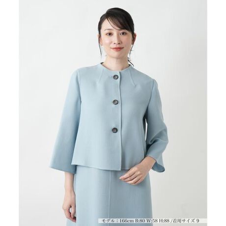 エレガントで洗練されたデザインのノーカラージャケット。フロントの大きめボタンがアクセントとなり、シンプルながらも上品な印象を与えます。柔らかな風合いの素材を使用し、軽やかな着心地が魅力。程よく広がる袖口が女性らしさを引き立て、動きやすさも兼ね備えています。ショート丈のシルエットがスタイルアップ効果を演出し、ワンピースやスカートと合わせてフォーマルなシーンにも対応可能。オフィスや特別な場面で活躍する一着です。