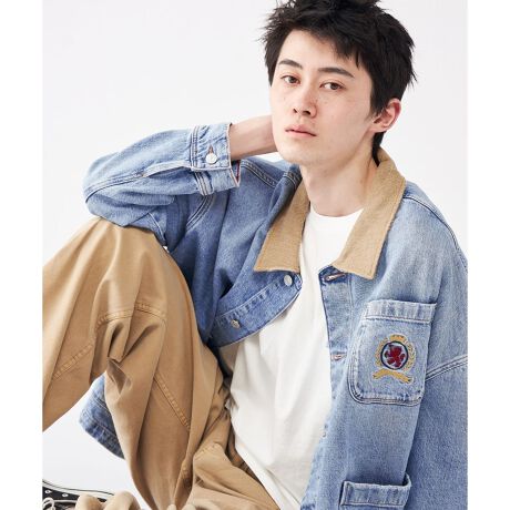トレンドのワークスタイルを作り上げるチョアジャケット。衿は表裏で配色を切り替え、左胸にはクレスト刺しゅうを施しました。淡色デニムを使用することでヴィンテージの表情を漂わせながら軽やかな印象に。シルエットはリラックスフィットで、ボリュームが出すぎないように裾はやや短めに調整しています。