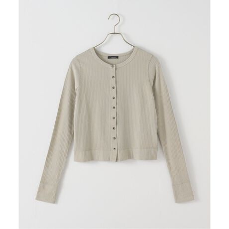 コンパクトなカーディガンをジャーナルらしくカジュアル見えに仕上げた1枚。
