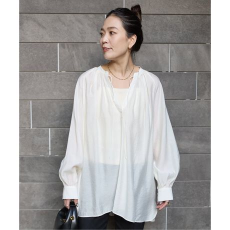 シアーにハリ感をプラスした、肌離れがよくドライタッチな素材を使用し、オーガンジーとはまた違ったざらつかないやさしい風合いが特徴。