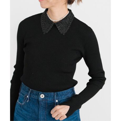 襟のレースがポイントのリブニット。