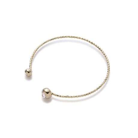 華奢なラインで手元をほっそり見せてくれるバングル。ひねりを加えたようなラインの先にはビジュー調がきらっとアクセントになります。ONにもOFFシーンにも取り入れやすく、シーズンレスでお使いいただけるアクセサリーです。※モデルの着用画像の場合、光の当たり具合により、実際の色味と異なって見えることがございます。色味は、商品単体の画像をご参照ください。